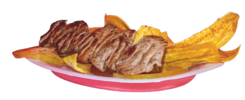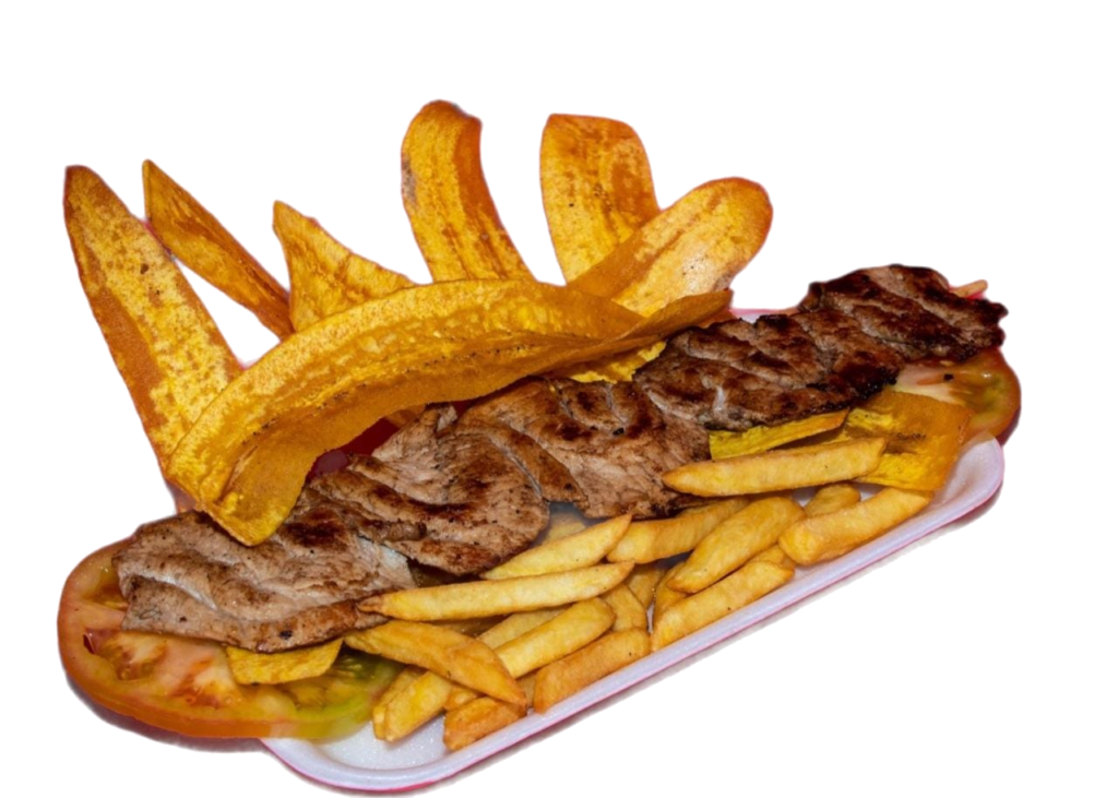 apas a la francesa, tomate, tajada de platano verde.